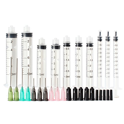 - 30 items in total, including 10 pcs different ml luer lock syringes, 10 pcs different gauge blund needles and 10 pcs air-tight tip caps, good starting point from which to decide if you need bigger or smaller.